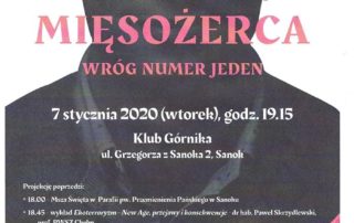 7 stycznia 2020 r. po Mszy Świętej wieczornej w Klubie Górnika odbędzie się ciekawe spotkanie. O godz. 18.45 wykład p. prof. dra hab. Pawła Skrzydlewskiego nt. „Ekoterroryzm – New Age, przejawy i konsekwencje”, a po nim o godz. 19.15 film pt. „Mięsożerca – wróg numer jeden”. Wstęp wolny. Zaprasza Parafialny [...]