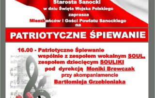 15 sierpnia 2019 r. w dniu Święta Wojska Polskiego na dziedzińcu sanockiego zamku odbędzie się "Patriotyczne Śpiewanie". O godzinie 16.00 wystąpi zespół "Soul" wraz z dziecięcym zespołem "Souliki" pod dyrekcją p. dr Moniki Brewczak i akompaniamencie Bartłomieja Grzebieniaka. Wstęp na to wydarzenie jest bezpłatny. Zapraszamy